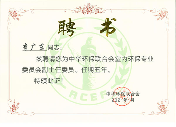 繼成為中華環(huán)保聯(lián)合會(huì)會(huì)員、中華環(huán)保聯(lián)合會(huì)室內(nèi)委員會(huì)成員后,休文公司經(jīng)理李廣東受聘任中華環(huán)保聯(lián)合會(huì)室內(nèi)委員會(huì)副主任委員。
