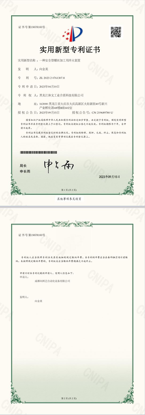 實用新型專利證書