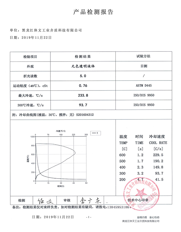 經(jīng)權威機構,本產(chǎn)品冷卻降溫性能在高溫區(qū)(600℃)達230℃/s,低溫區(qū)(300℃)達94℃/s,實現(xiàn)了高溫區(qū)降溫快、似水,低溫區(qū)降溫慢、似油,同時兼具油和水的冷卻特性的理想目標,尤其對直徑大于300毫米的實芯工件淬透性好,是一種理想的淬火液。